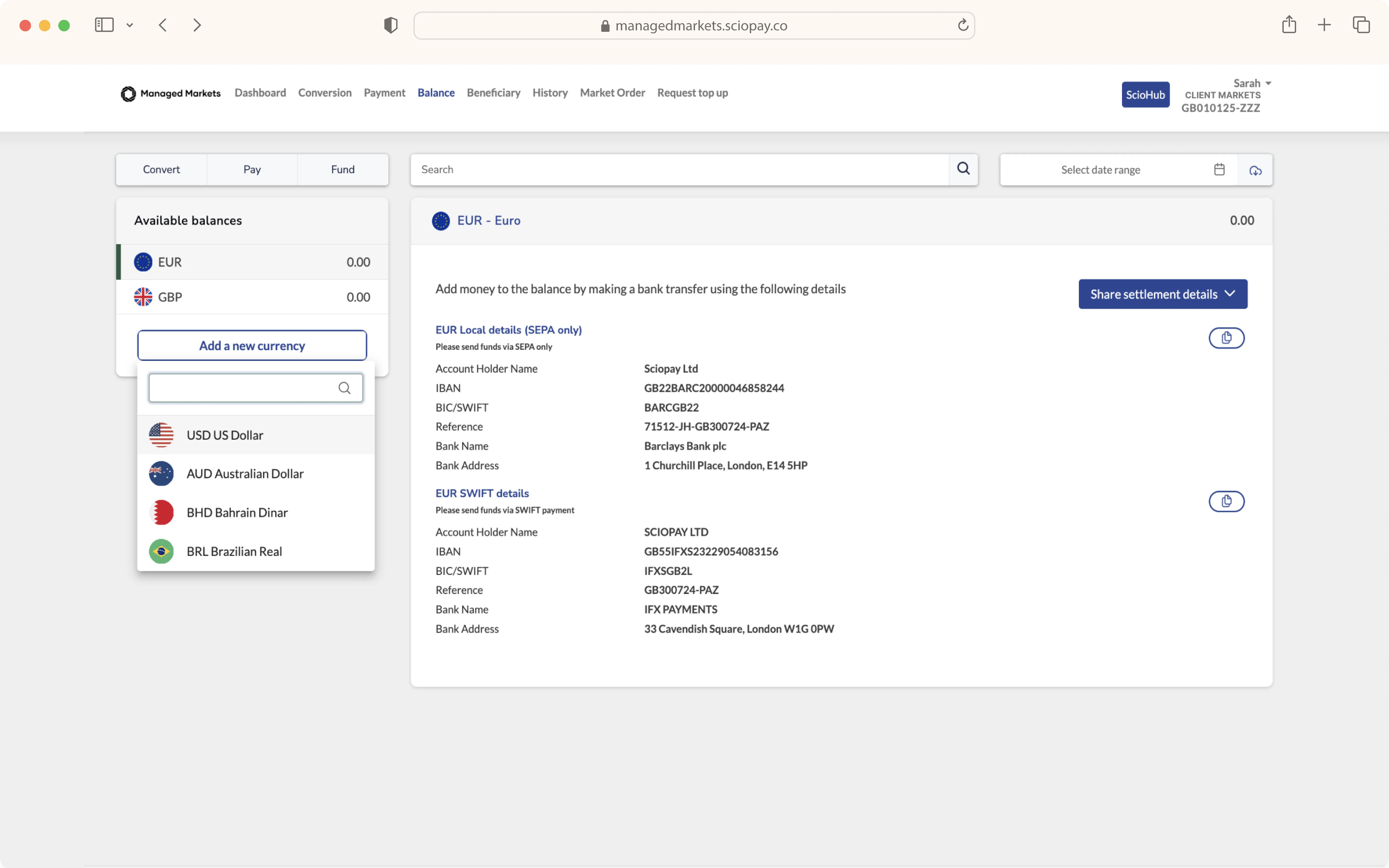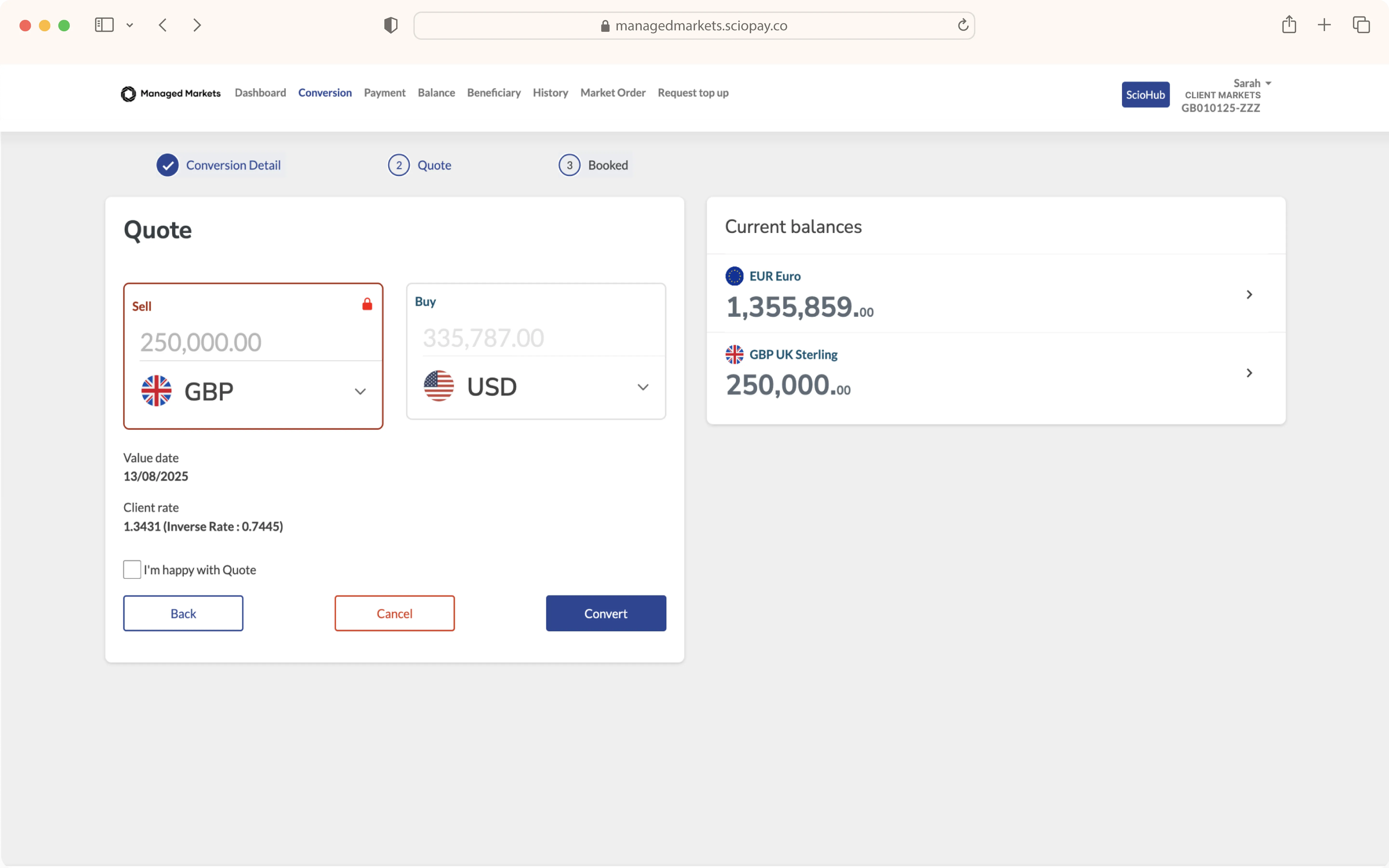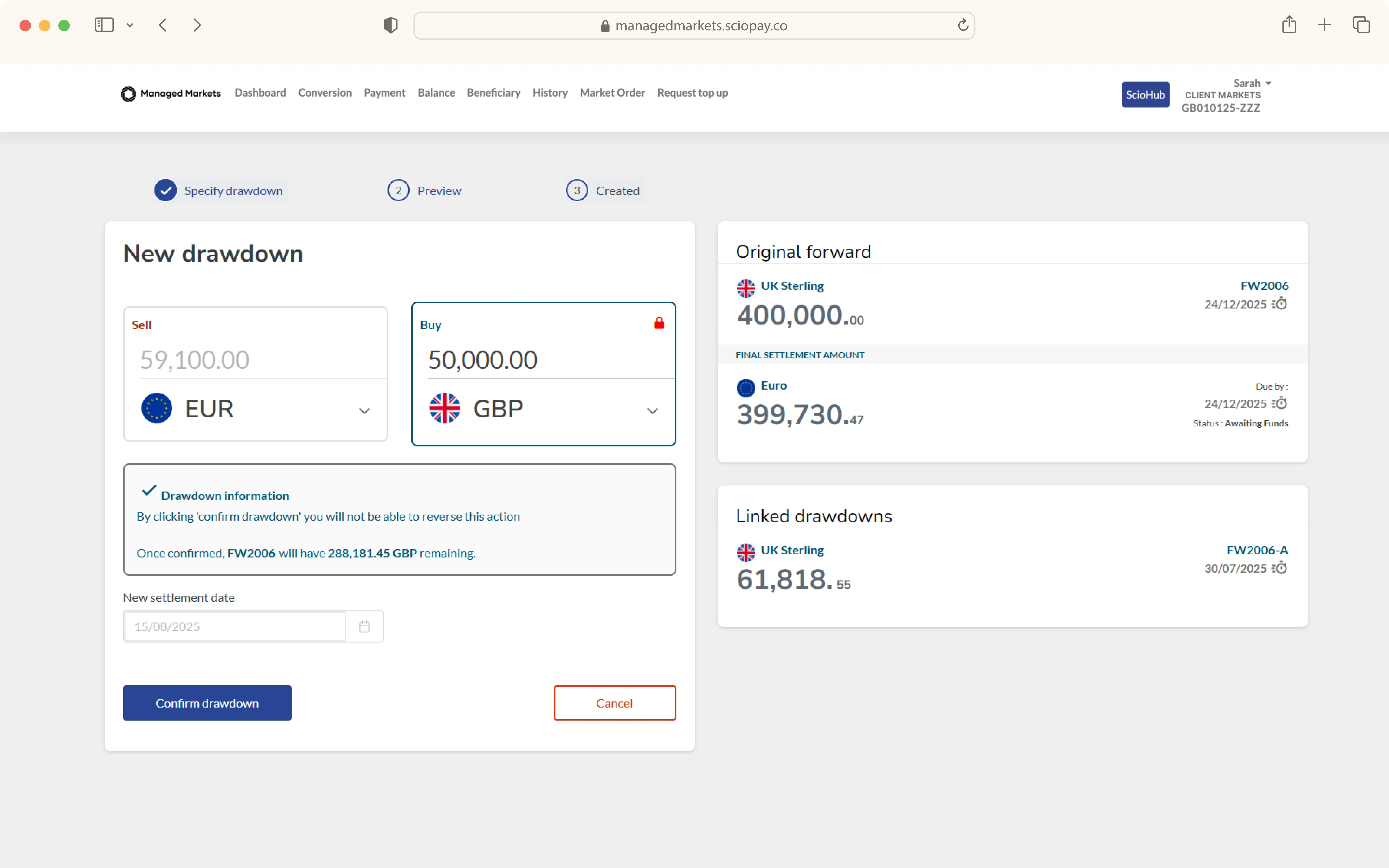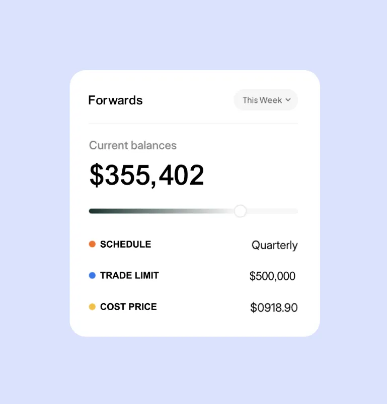 Lock in an exchange rate for a future date to settle in portions over time allowing you to guarantee your margin and stay above your budget rate. Pre booked deals can be viewed on the portal with your live balances ready for draw downs.